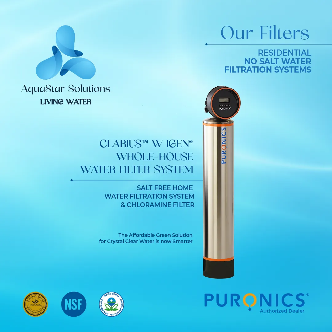 The Puronics® Clarius™ iGen® C whole-house Chlorostatic® water filter system combines the intelligence of the patented iGen® control valve and Green technology to efficiently provide crystal clear, great-tasting water with No Salt and No Chemicals needed.