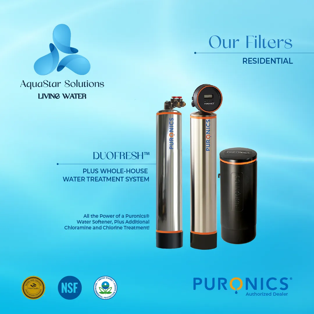 The Puronics® DuoFresh™ Plus dual process whole-house water softener and Chlorostatic® filtration system is designed to provide all the benefits of softened water, plus, additional filtration to significantly reduce the levels of harsh chloramine and chlorine.
